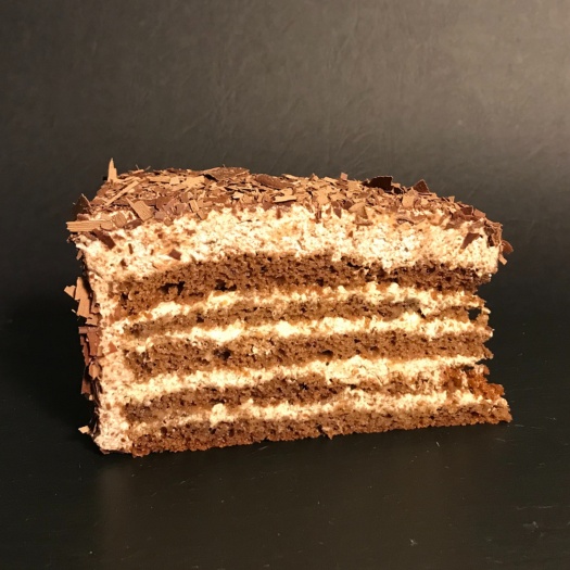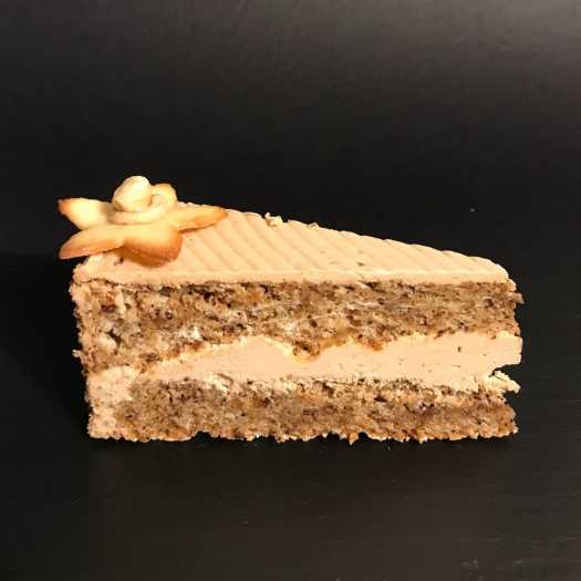 Dunkles Biskuit, Sahne, Butter, Haselnüsse, Schokolade.