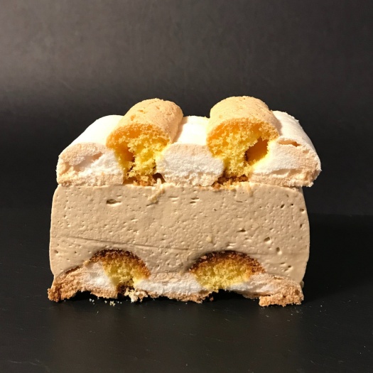Helles Biskuit, Eiweißmasse, Sahne, Moccapaste.