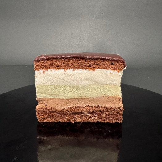 Dunkles Biskuit, Schokocreme, Pistaziencreme, Sacherglasur.