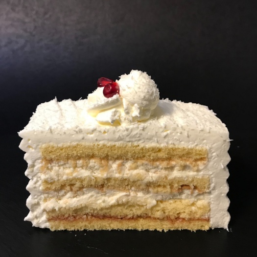 Helles Biskuit, Sahne, Raffaelocreme, Mandeln, Kokosflocken, Marmelade.