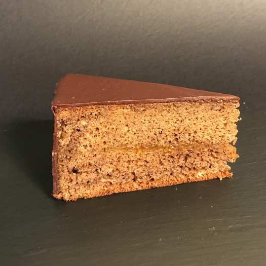 Dunkles Biskuit, Butter, Schokolade, Marillenmarmelade, Mandeln, Sacherglasur.